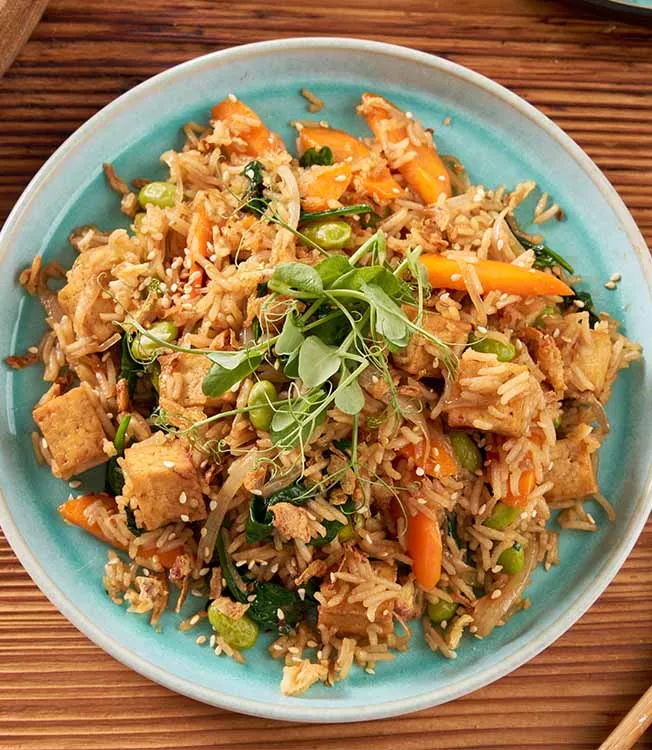 Aromatic fried jasmine rice with crispy tofu, edamame and fresh spinach glazed with Kikkoman Teriyaki Glaze. Quick, hearty and full of Asian flavour.