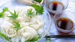 Somen noodles are very fine, white and long noodles made of wheat, salt and water. They are thinner than udon. Somen is a popular dish in hot weather, when it is served cold with a dipping sauce (dashi), soy sauce and fresh ginger.