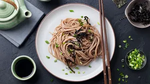 Grey-brown soba noodles are an important element of traditional Japanese cuisine, which is known as washoku. Buckwheat and water are mixed together to make soba, and it is the buckwheat that gives the noodles their delicate yet distinctive nutty flavour. When matcha is added to the mix the noodles take on a light green colour. Soba is traditionally eaten cold with various dips and as a noodle soup ingredient. Most soups with soba have a fish stock (dashi) base seasoned with soy sauce. The seasonal ingredients that are used in soba dishes and the toppings are generally the same as the ones in udon dishes.