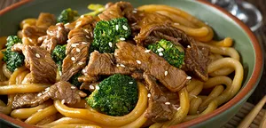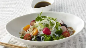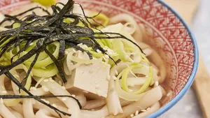 Udon noodles are also native to Kikkoman’s homeland of Japan. Like European pasta they are made from wheat, salt and water. These are the thickest of all Japanese noodles and often served in a hot broth made from fish stock (dashi), seasoned with soy sauce, mirin and sometimes a sprinkling of mixed chilli pepper (shichimi). Typical toppings include finely chopped spring onions, shrimps and vegetables fried in tempura batter (kakiage), tofu pouches (aburaage) and slices of kamaboko, which is Japanese fish cake. Udon noodles, broth and toppings differ from region to region. The noodles are suitable for stir frying to complement vegetables, meat and fish. Stir-fried udon is called yaki udon. In summer people often eat cold udon in soups, noodle dishes or salads with whatever ingredients are in season.