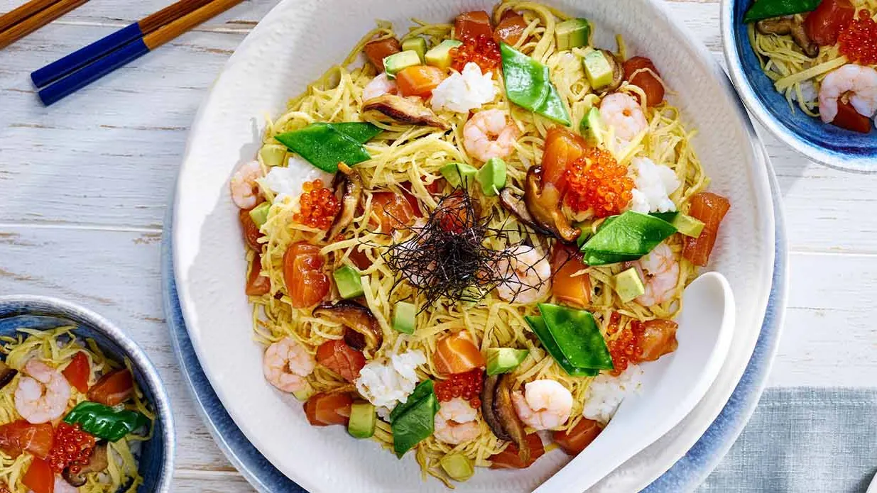 Chirashi sushi – also known as “scattered sushi”, is a traditional Japanese sushi variant in which rice with various ingredients is loosely arranged in a bowl. Try this version with marinated salmon, colorful vegetables and fine omelette strips. Wonderfully fresh and great for sharing. Perhaps a suggestion for the next takeaway party?