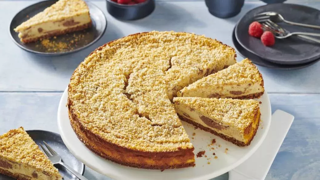 Butter, sugar, ground almonds and Kikkoman Panko – Japanese style crispy bread crumbs – that’s all you need to create a crunchy base for this delicious dessert. Spread the base with a creamy cheesecake filling featuring luscious chocolate swirls, top it all with a mixture of ground almonds and Kikkoman Panko, and hey presto: a tempting treat for anyone with a sweet tooth.