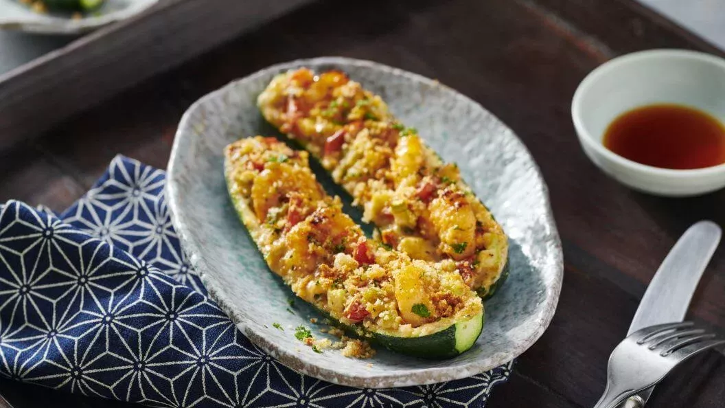 What makes this recipe so special? Its colourful combination of courgettes, cherry tomatoes, parsley and prawns. The flesh is scooped out of the courgettes and sautéed with the prawns, tomatoes and parsley. The cream is then added, and the mixture is brought to the boil. This creates a brightly coloured filling for the hollowed-out courgettes, which are finished off in the oven. Finally, a topping of parmesan cheese and Kikkoman Panko – Japanese-style crispy bread crumbs adds a satisfying crunch.