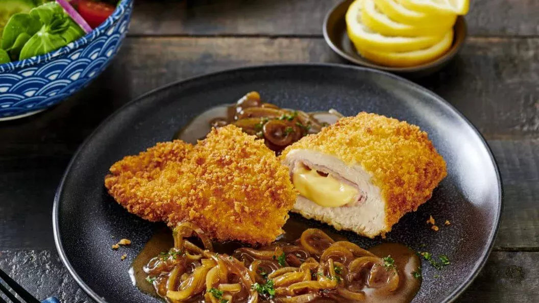 This tasty recipe takes a fresh chicken breast fillet and transforms it into a juicy cordon bleu. The chicken is stuffed with ham and cheese then coated in flour, egg and finally Kikkoman Panko – Japanese style crispy bread crumbs. It’s then deep-fried at just the right temperature to create a deliciously crispy golden-brown coating. Wondering what to serve it with? Try Kikkoman’s wonderful onion sauce recipe, featuring Teriyaki BBQ-Sauce with Honey for a subtle, sweet flavour.