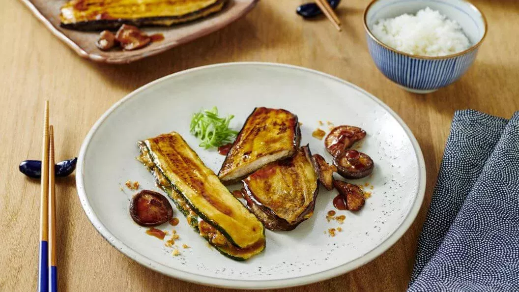 This yummy recipe involves slicing an aubergine or courgette, spooning a little filling onto each slice and sandwiching them together in pairs. The spring onion, chicken and tofu filling has a light, pleasant crunch to it thanks to the addition of Kikkoman Panko – Japanese style crispy bread crumbs. The filling is seasoned with Teriyaki BBQ-Sauce with Honey before it is placed onto the vegetable slices. Made into ‘sandwiches’ and fried on both sides, the aubergine or courgette slices are then served with sautéed shiitake mushrooms.