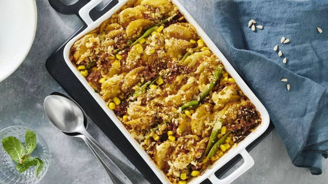 This vegetarian gratin with potatoes, sweetcorn, onions and mangetout is topped with Kikkoman Panko – Japanese style crispy bread crumbs to create a fabulously crunchy crust. The potatoes are precooked briefly in a mixture of cream, oat milk and Naturally Brewed Soy Sauce, while the onions are seasoned with Teriyaki BBQ-Sauce with Honey to give them a hint of sweetness. The result? A potato gratin that’s great as both a vegetarian main meal and a side dish.