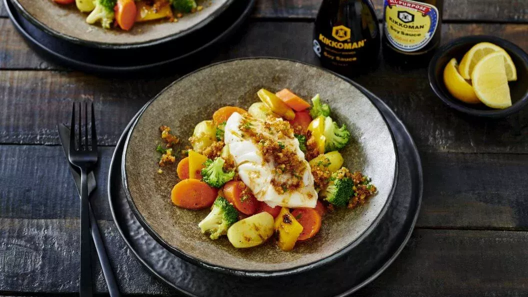 This is a real treat for fish lovers. In this recipe fresh cod fillet is served with potatoes, carrots, broccoli and yellow pepper – and a delicious panko butter sauce. Featuring shallots, parsley, lemon juice and Naturally Brewed Soy Sauce, the butter sauce complements the fish and vegetables perfectly. And it has the ideal consistency thanks to its star ingredient: toasted Kikkoman Panko – Japanese-style crispy bread crumbs.