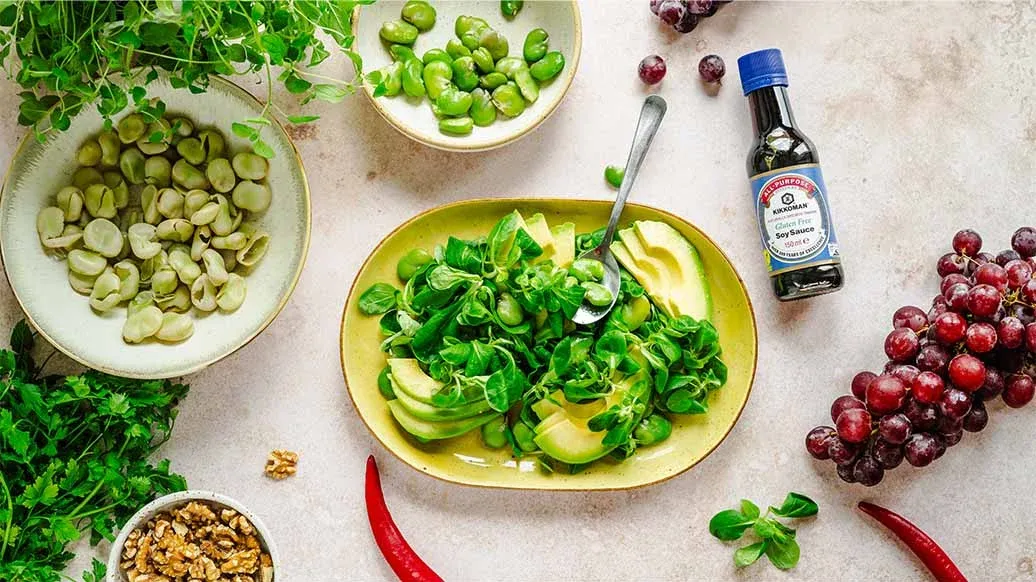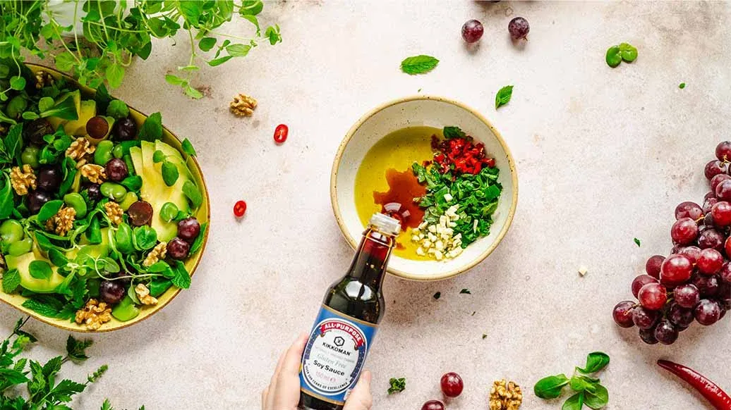 Finely chop the garlic, chilli pepper and herbs. Mix with the olive oil, Kikkoman Gluten free Soy Sauce and apple cider vinegar. Drizzle the chimichurri sauce over the salad.