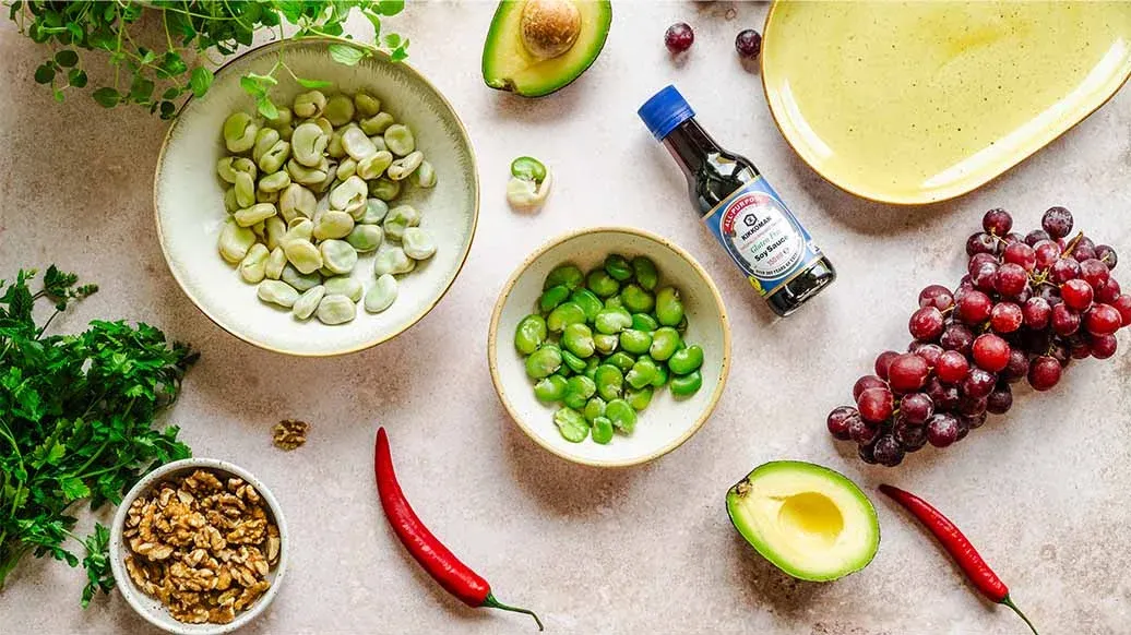 Sweet grapes, creamy avocado and tender broad beans meet crunchy walnuts in this vibrant summer salad, finished with bold chimichurri sauce—delicious on its own or as a side for lunch or grilled meals.