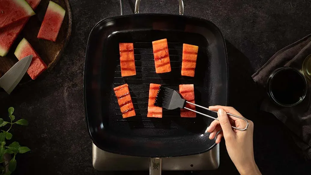 Lightly oil a griddle pan or grill. Briefly grill the watermelon slices over a high heat on both sides, then brush them with the Kikkoman Teriyaki BBQ-Sauce Honey and turn them over. Repeat a few times until the watermelon is nicely glazed.