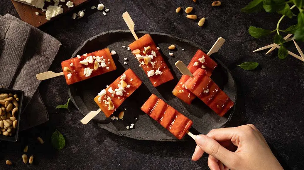 A fresh little starter for 2 or a creative snack for 6 people. Our popsicle-shaped melon sticks are great for parties—just prep everything in advance and grill and glaze them fresh at the party.