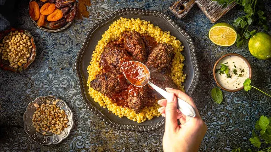 Fragrant beef kofta spiced with cinnamon, cumin and fresh herbs, simmered in a tangy tomato sauce with lime. Served with couscous, yoghurt and pine nuts, it's a warming dish full of Middle Eastern character.