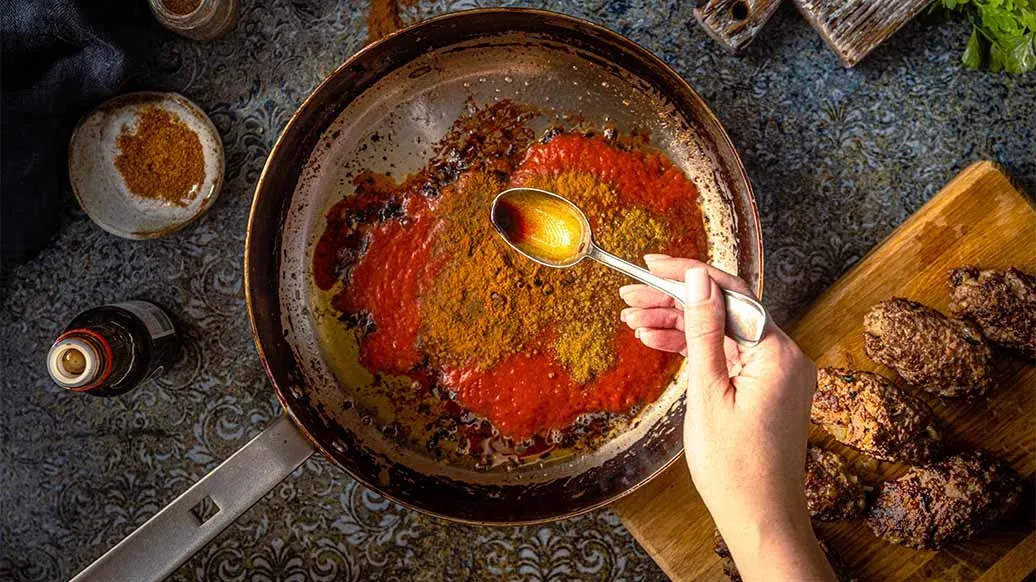 Remove the patties from the pan. Add the strained tomatoes to the pan with the cooking juices. Stir in the cinnamon, cumin, chilli powder and Kikkoman Soy Sauce. Cover and simmer for about 15 minutes.