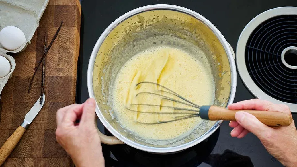 1 vanilla pod – 3 egg yolks – 8 g vanilla sugar – 1 tbsp sugar – 125 ml double cream – A sprig of mint