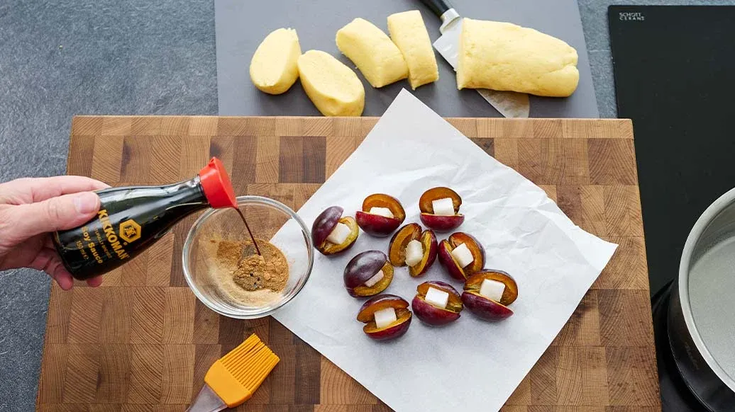 Score and stone the damson plums, placing one sugar cube inside each. Stir the cinnamon, cardamom and Kikkoman Soy Sauce together. Brush the plums with the mixture. Bring a large saucepan of water with the salt to a boil. On a floured surface, roll the potato dough into a log about 5 cm thick. Cut into 8 slices and flatten slightly. Place one damson plum on each slice, shape into dumplings and poach them in the simmering water for 10–15 minutes until cooked.