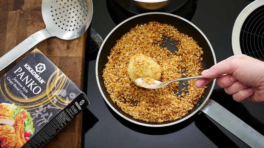 Melt the butter in a large frying pan and toast the Kikkoman Panko until golden brown. Remove the cooked dumplings from the water with a slotted spoon, drain well and roll in the buttery crumbs.