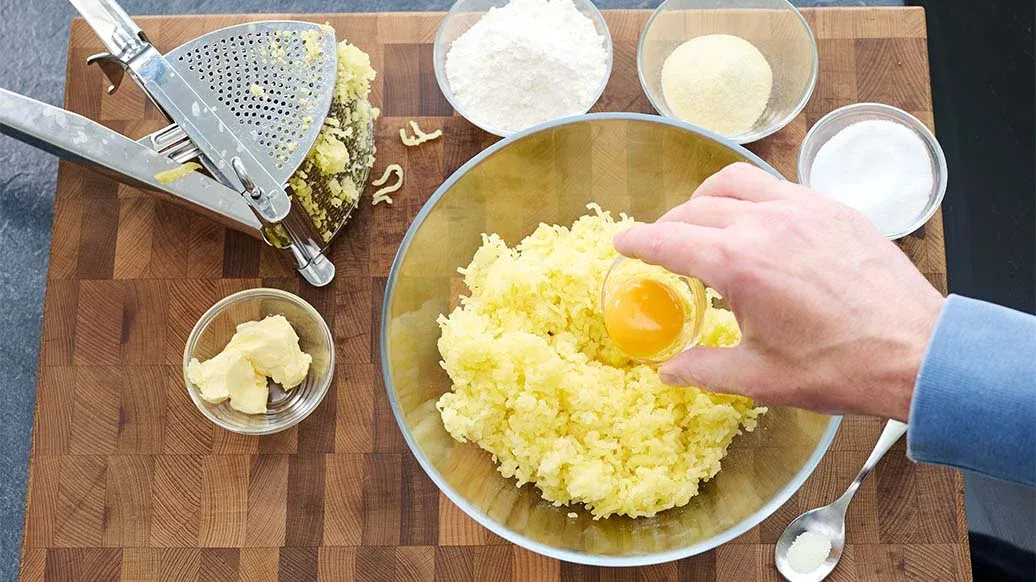 400 g floury potatoes – 100 g plain flour – 25 g semolina – 20 g soft butter – 1 egg yolk – 50 g sugar – ½ tsp salt