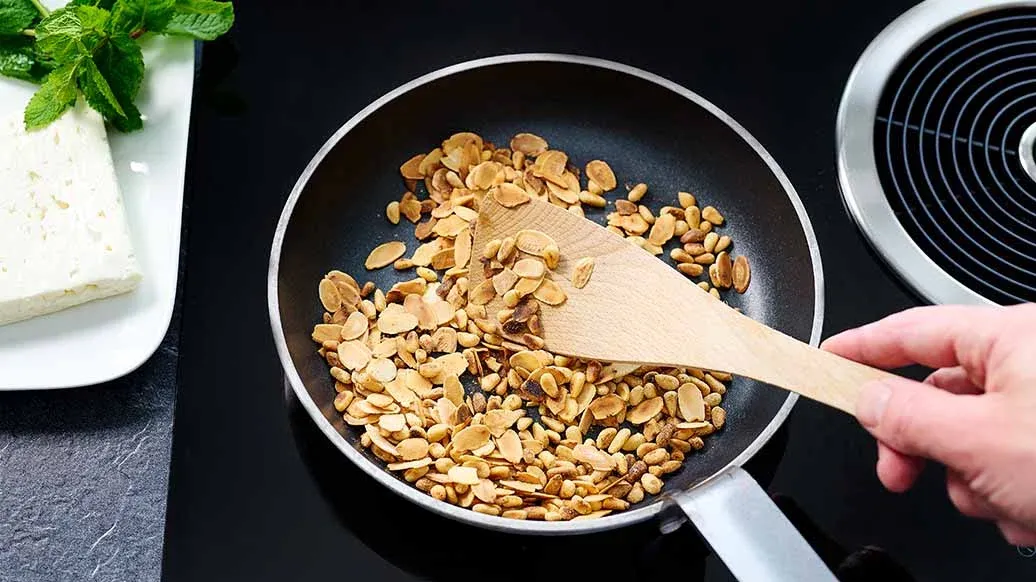 20 g flaked almonds – 20 g pine nuts – 100 g feta (or goat's cheese)