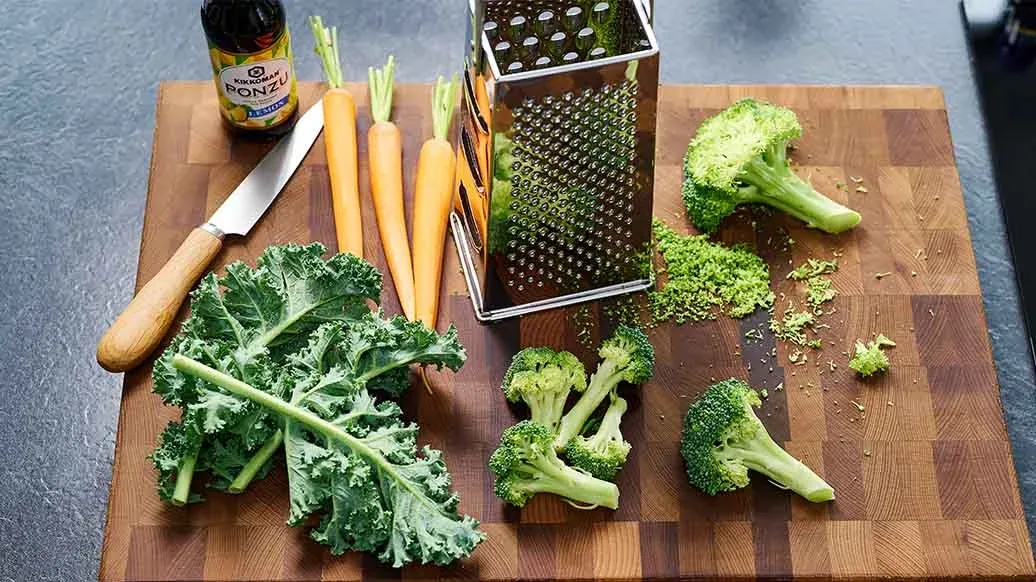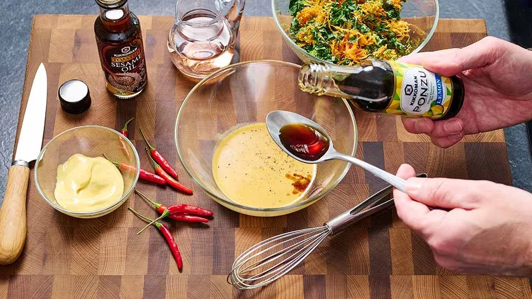 To make the dressing, finely chop the chilli, whisk with the Kikkoman Ponzu Lemon, Kikkoman Sesame Oil, vinegar, mustard and agave syrup, then season with the pepper. Mix the dressing with the kale, broccoli and carrots.