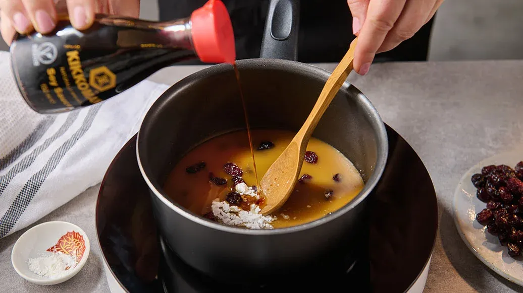 40 ml Kikkoman Naturally Brewed Soy Sauce – 120 ml Kikkoman Mirin-Style Sweet Cooking Seasoning – 80 g dried cranberries – 1 tsp cornstarch