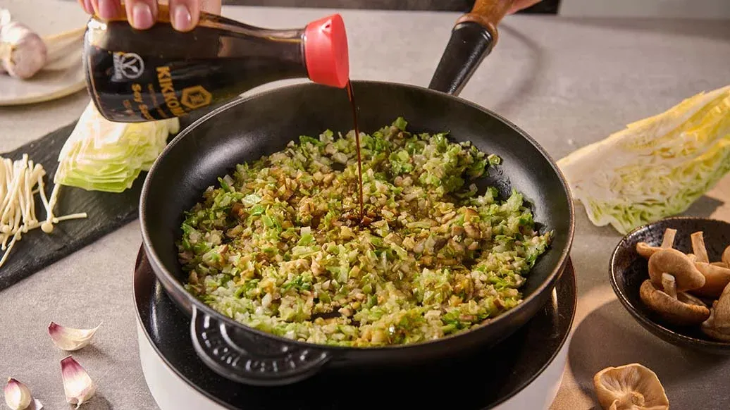 Finely chop the vegetables for the filling and fry in oil for about 10 minutes until the ingredients are soft. Season with the Kikkoman Soy Sauce.