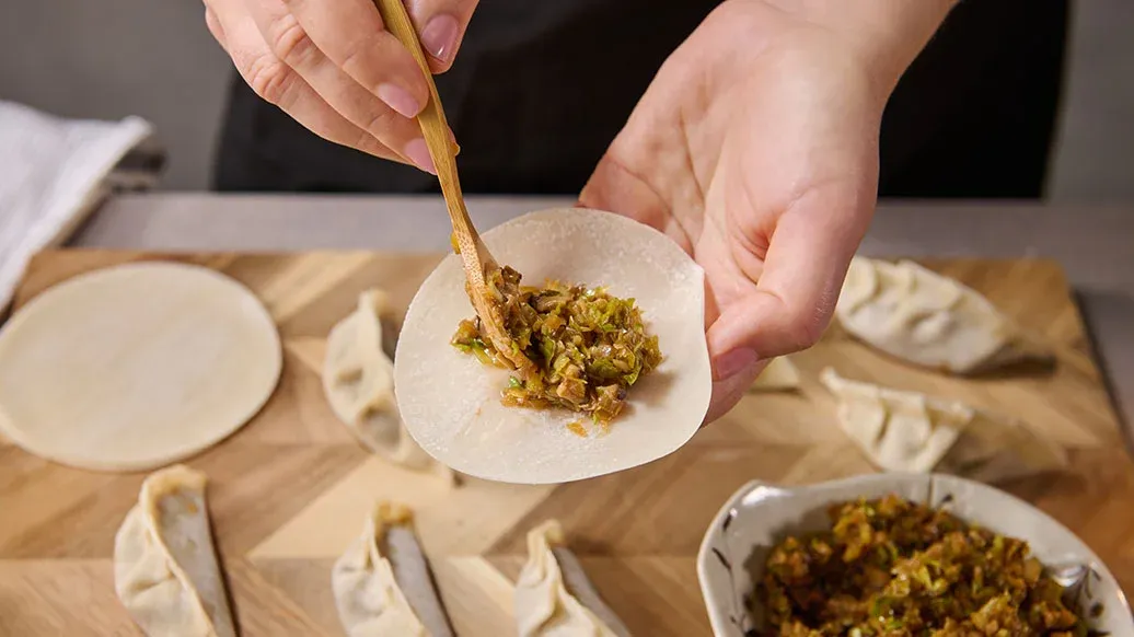 Fill the pastry sheets with the filling from step 1 and roll them into gyoza dumplings.