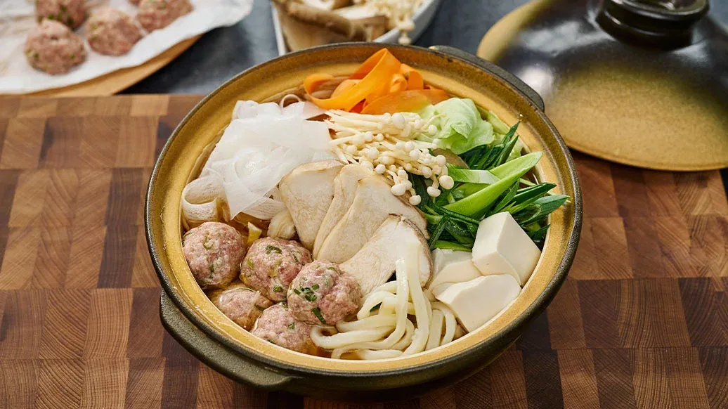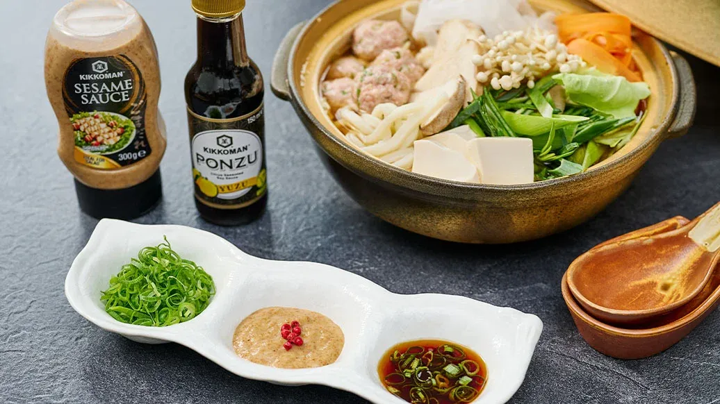 Once served in sumo stables for strength and stamina, this hearty broth is packed with tofu meatballs, fresh vegetables and noodles, seasoned with Kikkoman Ramen Soup Base and Kikkoman Sesame Oil, and served with dipping sauces.