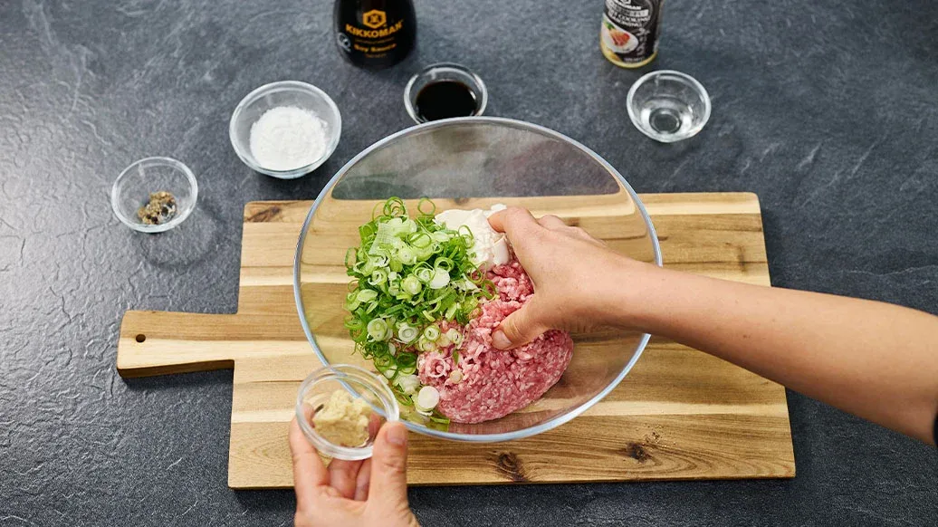 400 g minced meat, any kind – 100 g tofu – 1 tbsp Kikkoman Naturally Brewed Soy Sauce – 1 tsp Kikkoman Mirin-Style Sweet Cooking Seasoning – 2 tsp grated ginger – 3 spring onions, finely chopped – 2 tbsp cornflour – A pinch of black pepper