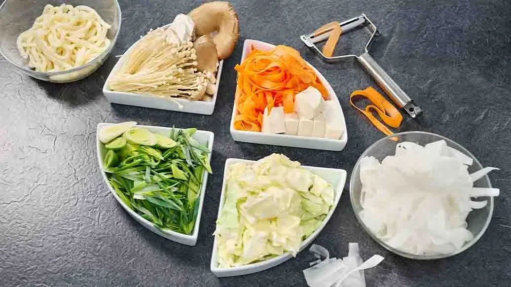 400 g napa cabbage (½ head) – 1 leek – 200 g daikon radish – 150 g carrot – 150 g mushrooms (e.g. shiitake, enoki) – 200 g tofu
