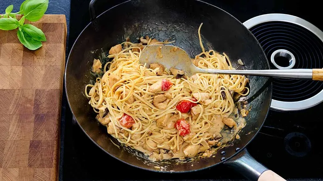 Mix the sauce with the pasta and chicken in the wok, arrange on plates, garnish with the basil and serve.
