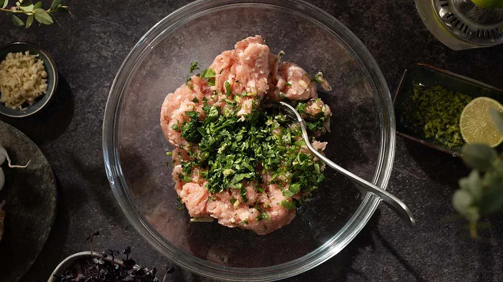 Knead the chicken breast with the lime zest, herbs, garlic and ginger. Using wet hands, shape into walnut-sized balls.