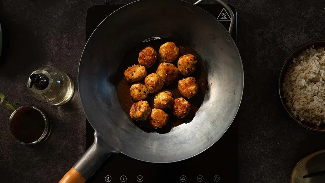 Fry the meatballs in a wok with rapeseed oil over a medium heat until golden brown on all sides, about 6 minutes in total. Turn down to the lowest heat, add the Kikkoman Teriyaki Sauce with Garlic and the lime juice, cover and simmer gently for another 6 minutes.