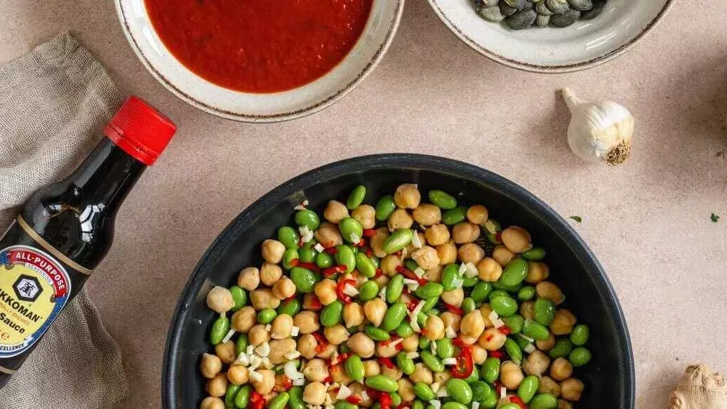 In another pan, heat the olive oil and sauté the chickpeas and edamame, along with finely chopped garlic, ginger, and chilli. Once golden brown, serve them with the sauce.