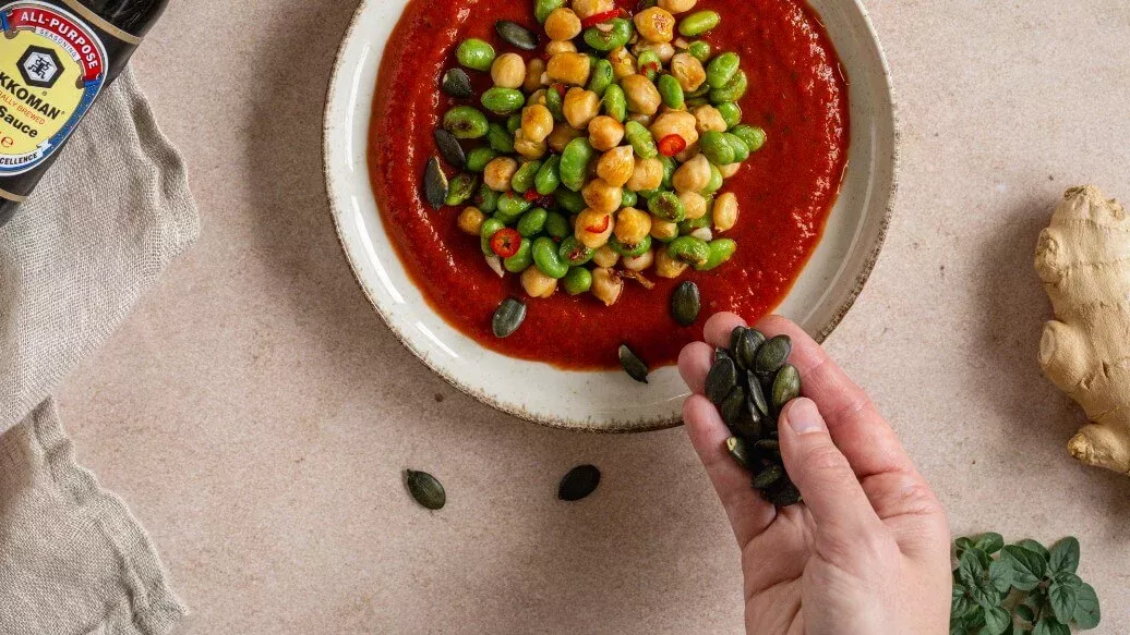 In this spicy vegan dish, chickpeas and edamame are served with an intensely peppery, thick sauce. A great idea for a warming winter meal.