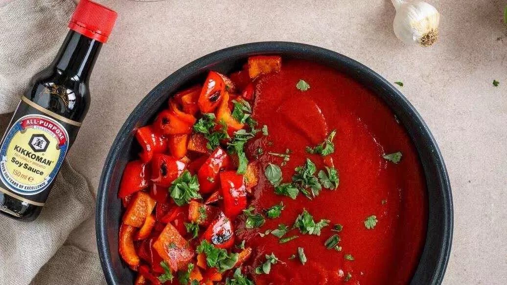 In olive oil, sauté the diced bell pepper. When the skin takes on a dark colour, add the herbs and tomato passata. Simmer the mixture for 10 minutes, season with Kikkoman soy sauce and ground pepper, and blend into a smooth sauce.