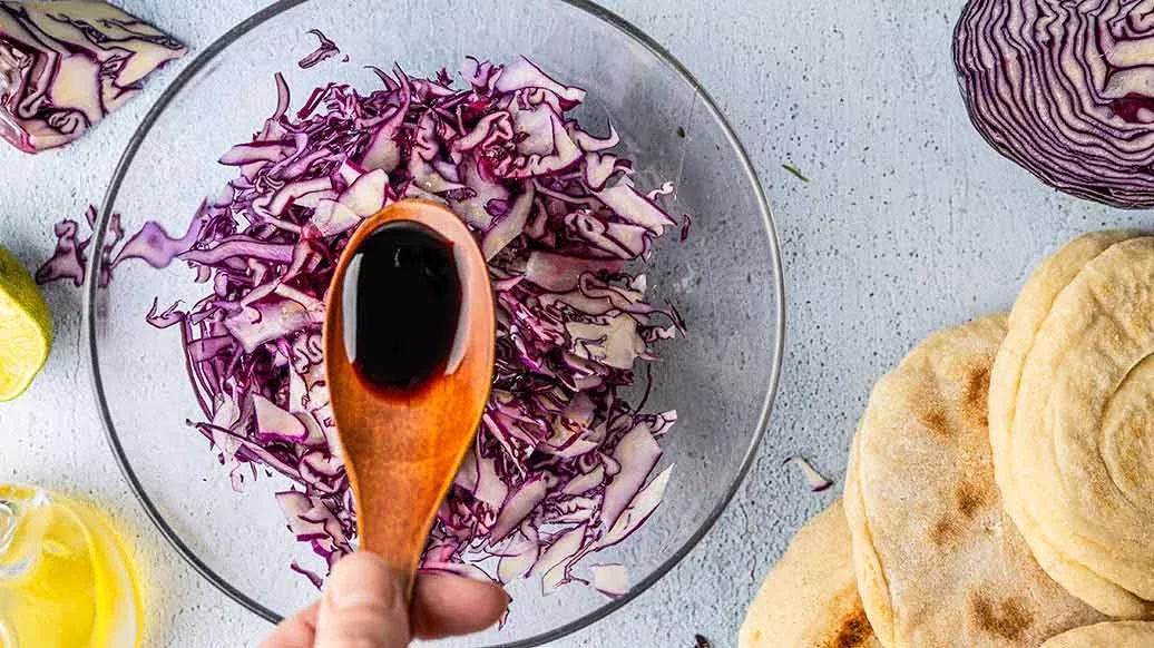 100 g red cabbage – 1 tbsp olive oil – 1 tbsp lime juice – 1 tsp honey