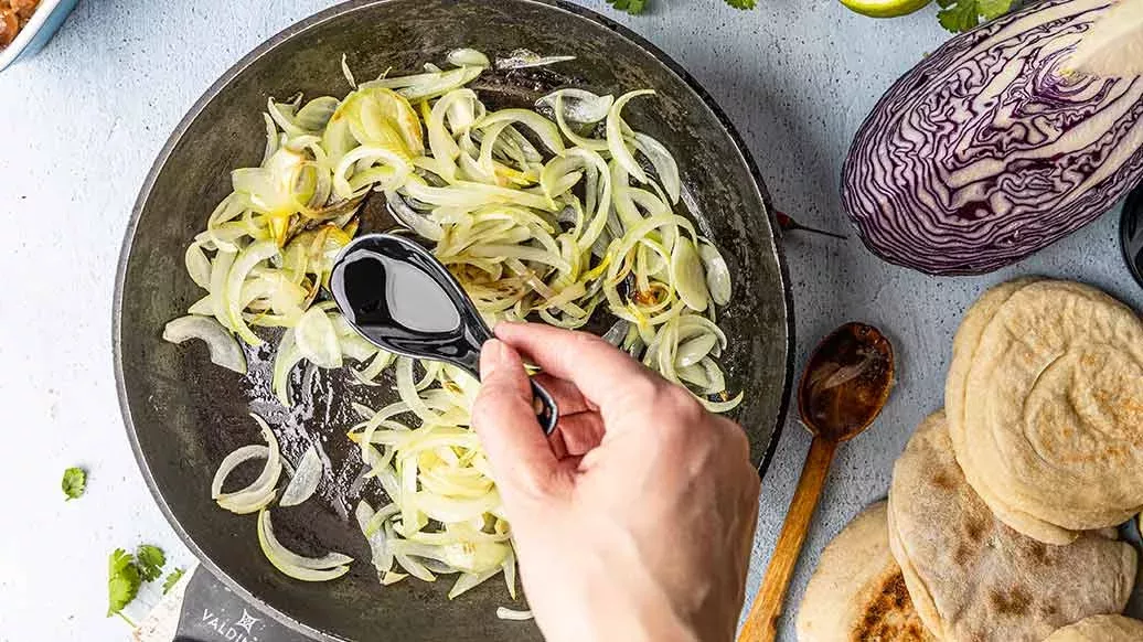 Cut the onions into strips and fry them in olive oil. Add Kikkoman Soy Sauce and sugar and simmer on a low heat for about 10 minutes.