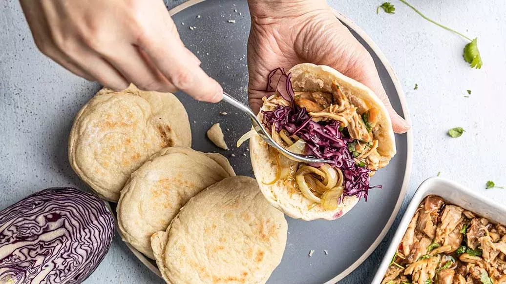 Indulge in a fusion of East and West with Rou Jia Mo - the Chinese take on a hamburger. The name literally means "meat in a bun". Our version features buns filled with chicken marinated in Kikkoman Teriyaki Sauce with Garlic, aromatic spices, crunchy cabbage and caramelised onions.