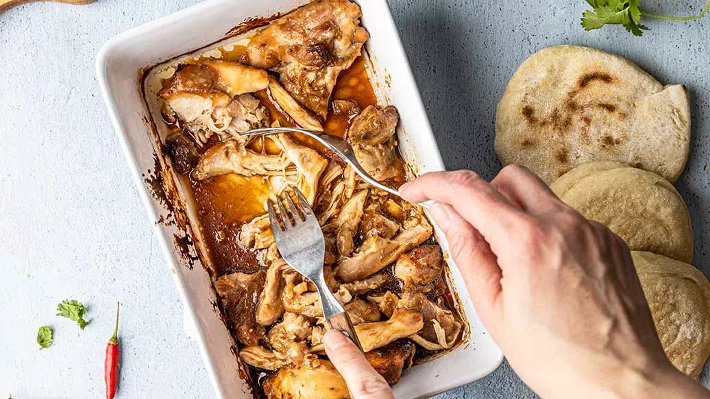 Cover and bake in the oven for 20-30 minutes at 180 °C until tender. After baking, shred the meat with a fork, add the coriander and chilli and mix with the remaining teriyaki marinade.
