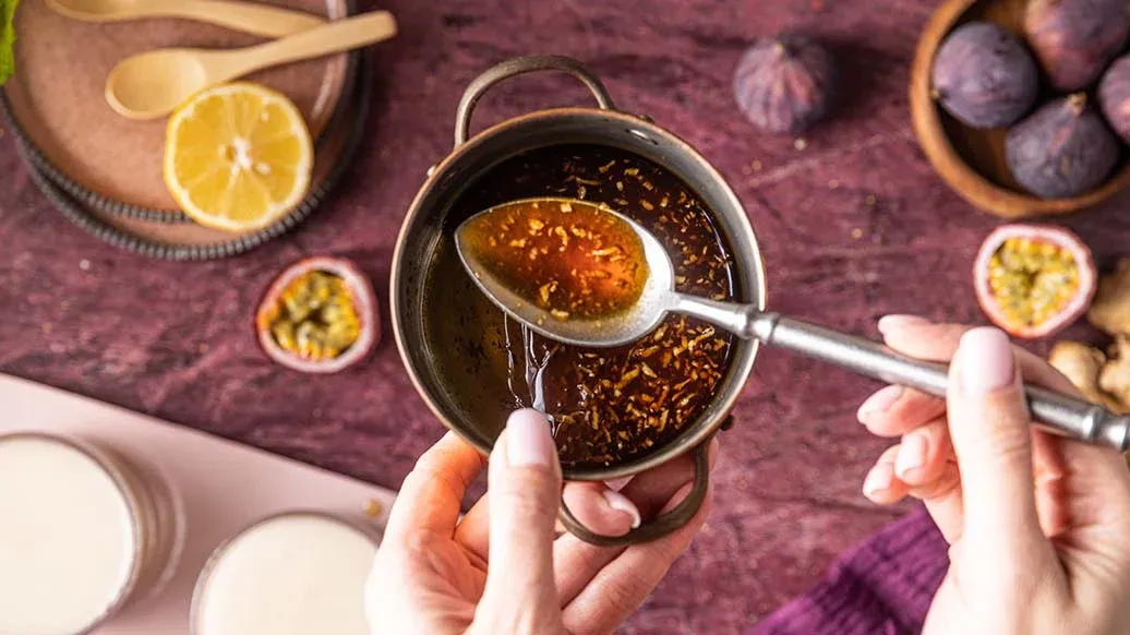 2 tbsp maple syrup – ½ Kikkoman Naturally Brewed Tamari Gluten free Soy Sauce – 1 tsp freshly grated ginger – 1 tsp lemon juice – 2 figs – 1 passion fruit – 1 tsp coconut flakes – Mint leaves for decoration
