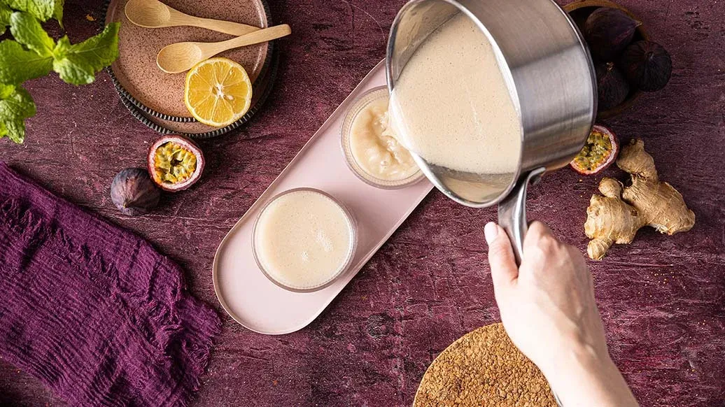 Meanwhile, prepare the syrup: combine the maple syrup, ginger, Kikkoman Gluten free Soy Sauce and lemon juice. Heat for 1-2 minutes, strain through a sieve and leave to cool. Cut the figs into quarters and scoop out the passion fruit pulp. Serve the panna cotta topped with the soy-ginger syrup and decorated with the figs, passion fruit pulp, coconut flakes and mint leaves.