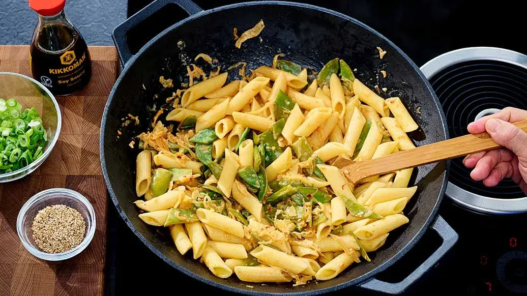 Cook the pasta according to the packet instructions and reserve about 100 ml of the cooking water when draining. Mix the cooking water with the gochujang paste, peanut butter, maple syrup and Kikkoman Soy Sauce.