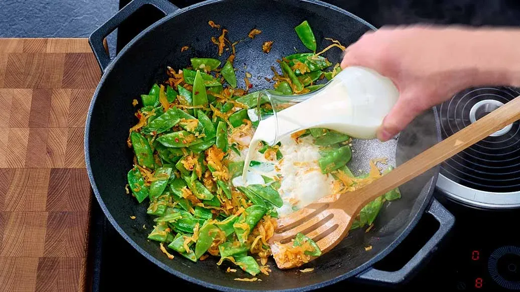 Finely chop the garlic and fry it in heated Kikkoman Sesame Oil in a large wok or frying pan. Add the kimchi and sugar snap peas (halve them if necessary) and fry briefly. Pour in the cream, bring to the boil and simmer for about 5 minutes.