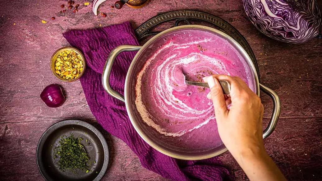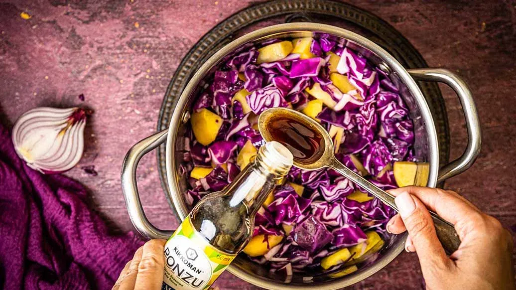 Add some colour to your winter meals with our red cabbage soup. Earthy red cabbage and potatoes blend with garlic and red onions, enhanced with Kikkoman Ponzu Lemon, dill, and a dash of cream — ideal for warming up on chilly days.