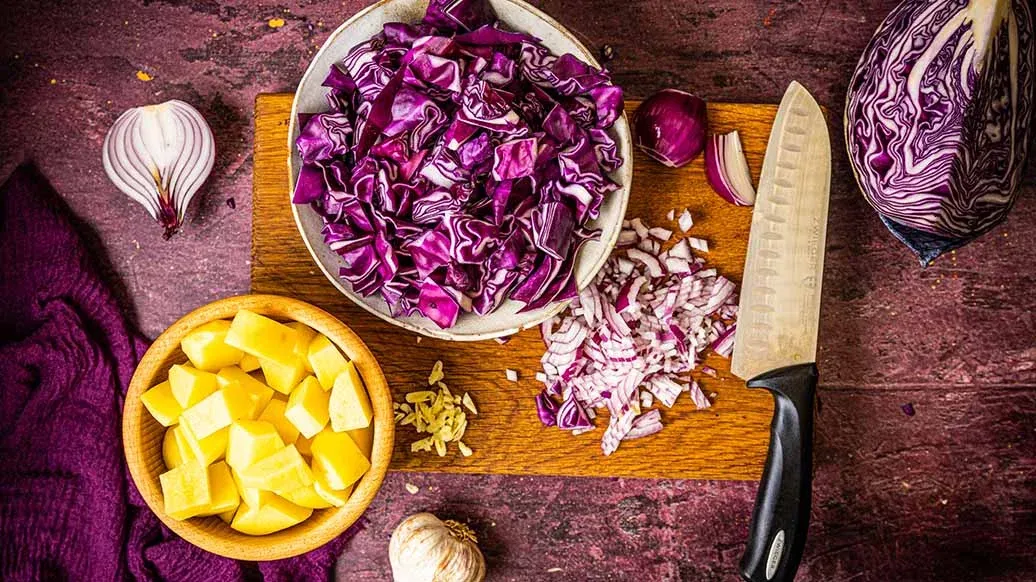 400 g red cabbage – 300 g potatoes – 1 red onion – 2 garlic cloves