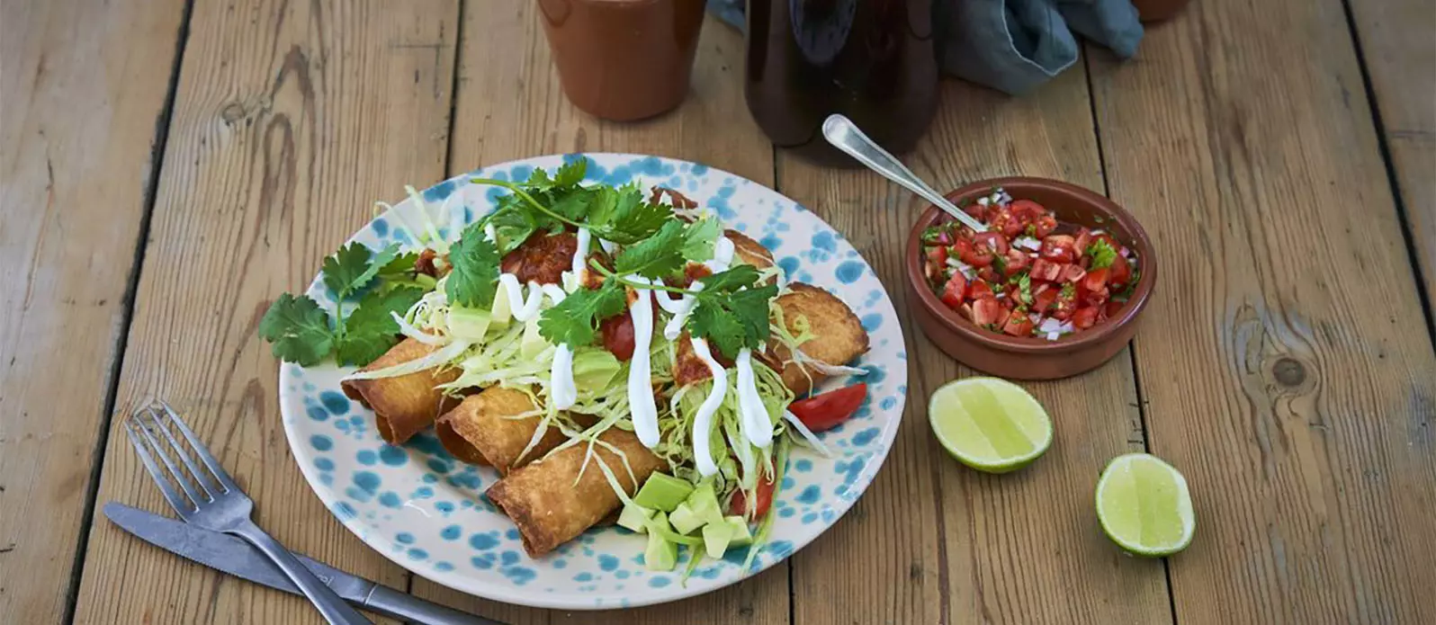 Place taquitos on a plate with finely sliced iceberg salad, tomatoes, crème fraiche, diced avocado, hot sauce and fresh coriander. Serve with the salsa.