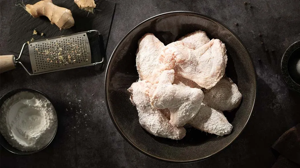 750 g chicken thigh fillets (cut into 5 cm x 5 cm pieces) – 2 pinch of freshly ground pepper – 3 tbsp finely chopped ginger – 150 g cornflour – 2 tsp baking powder