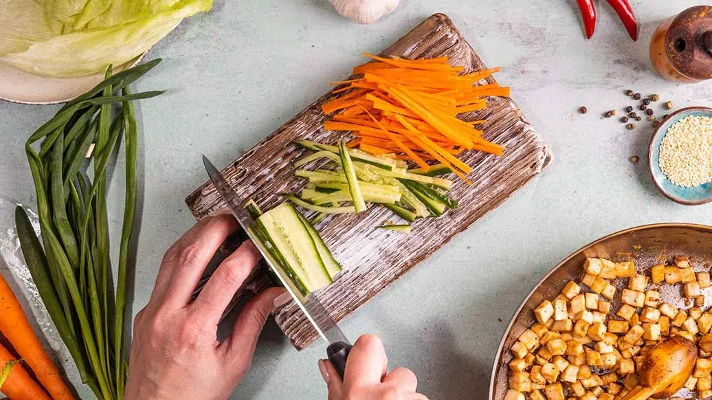 1 tbsp vegetable oil – 1 carrot – 1 cucumber – 4 iceberg lettuce leaves