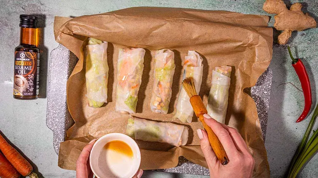 Soak the rice paper sheets in warm water and gently dry them. Place the vegetables and tofu on each sheet and roll them up. Brush with the Kikkoman Sesame Oil and bake in a preheated oven at 200°C or in an air fryer for 15 minutes.