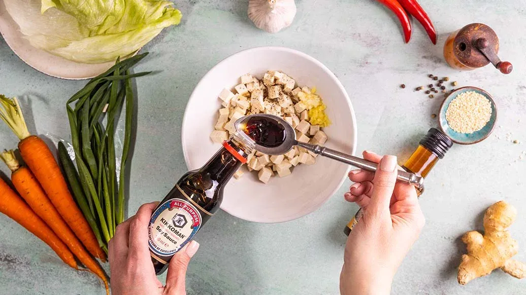 200 g tofu – 1 tbsp Kikkoman Toasted Sesame Oil – 1 tbsp Kikkoman Naturally Brewed Soy Sauce – ¼ tsp ground black pepper – ½ tsp grated ginger – 1 clove of garlic, crushed